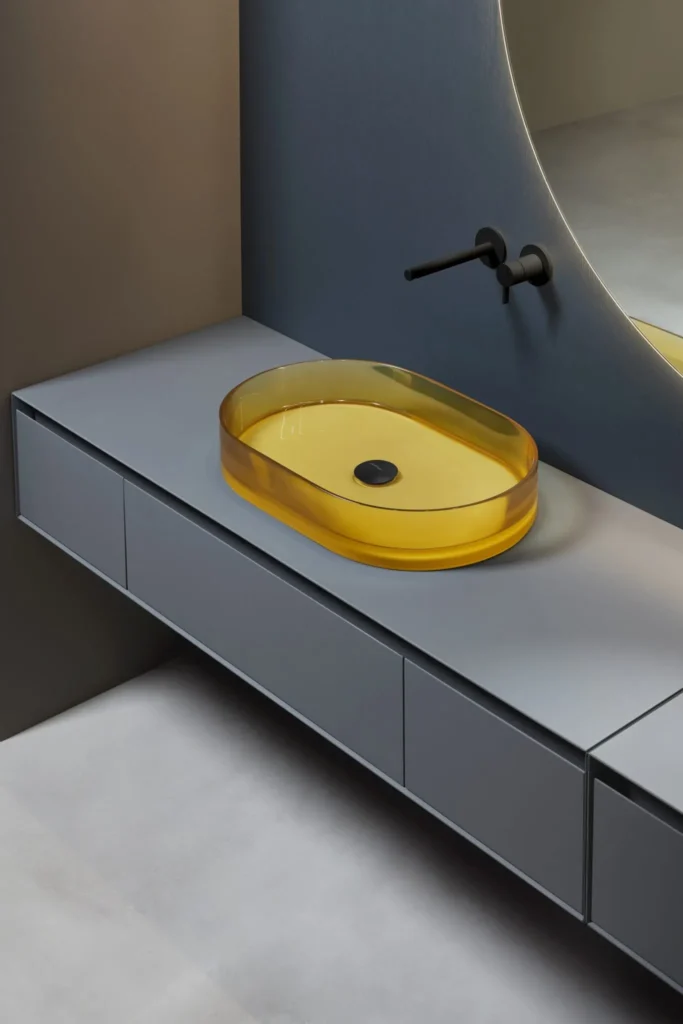 Available in square, rectangular, and oval (only made of Cristalmood and Icemood) variants, these basins feature a wide selection of materials, ensuring versatility and elegance in any bathroom setting.