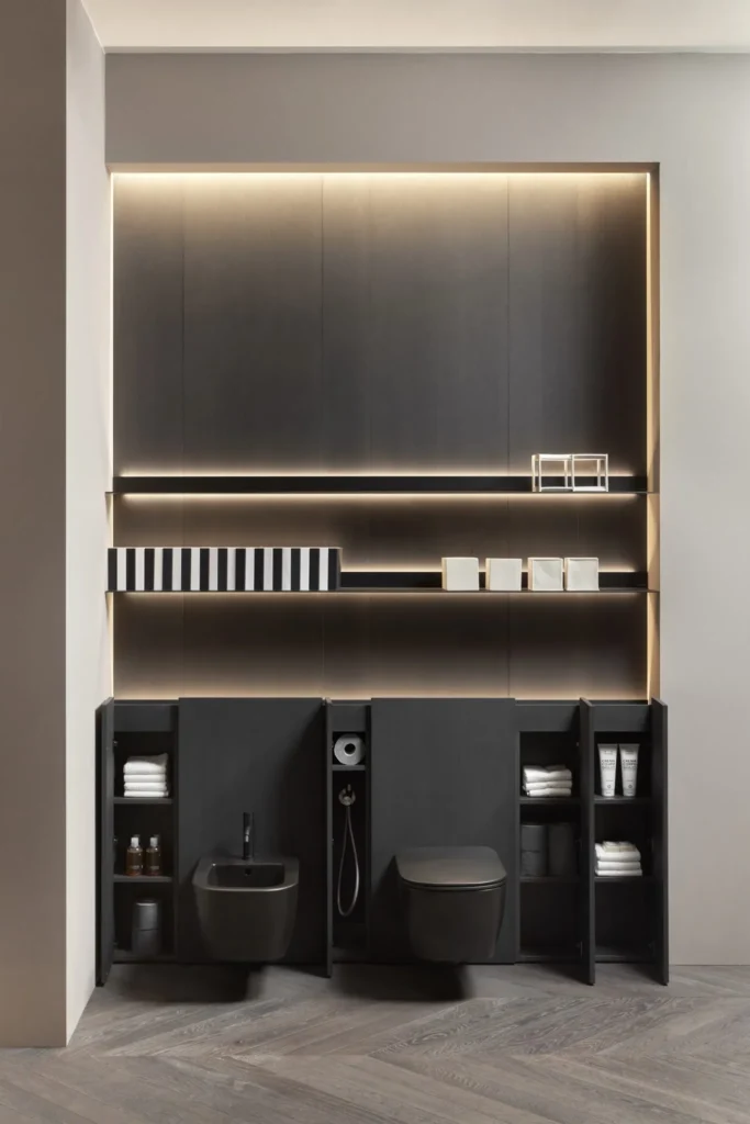 At the top, hidden doors reveal a practical storage channel and shelf, adding convenience to elegance. With a variety of finishes, materials, and colors, Offset allows for endless interpretations, transforming a functional element into a central piece of the bathroom design.